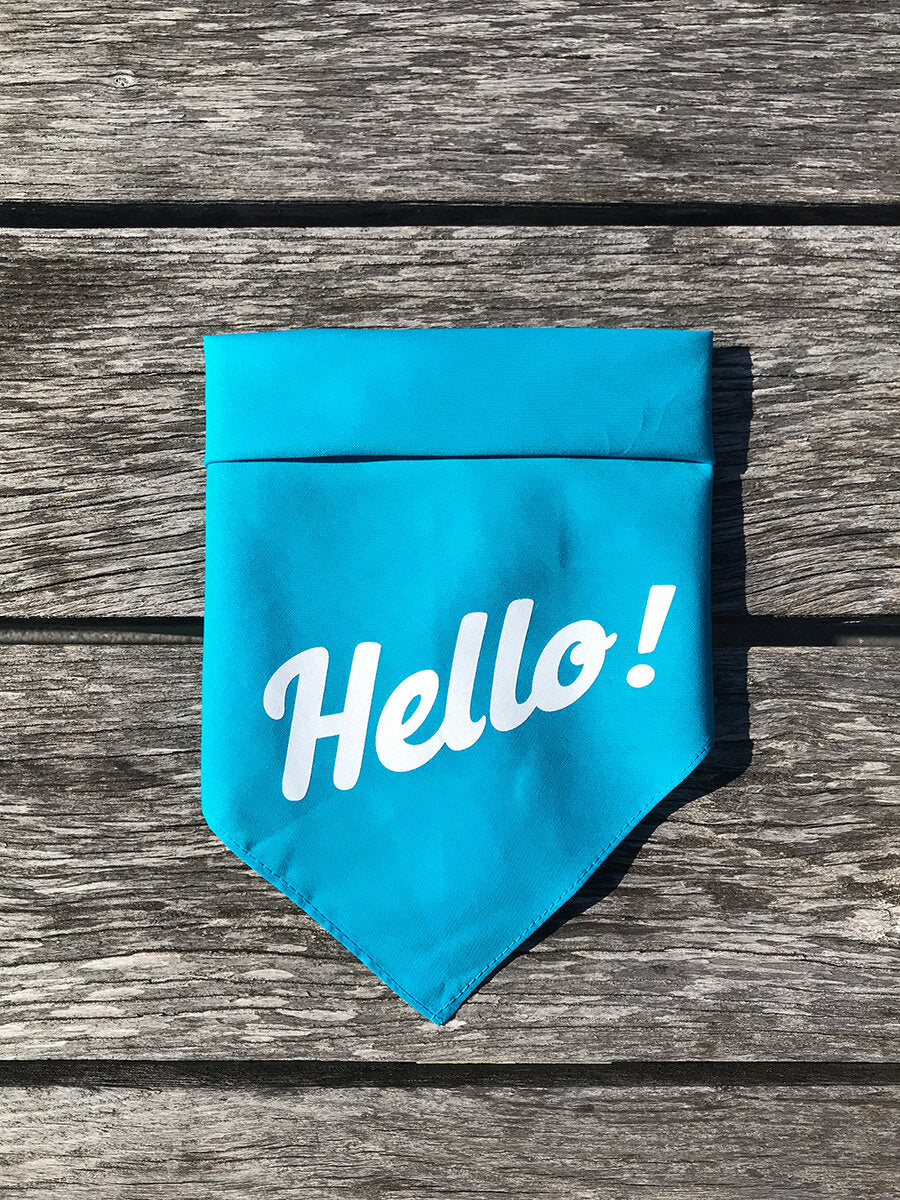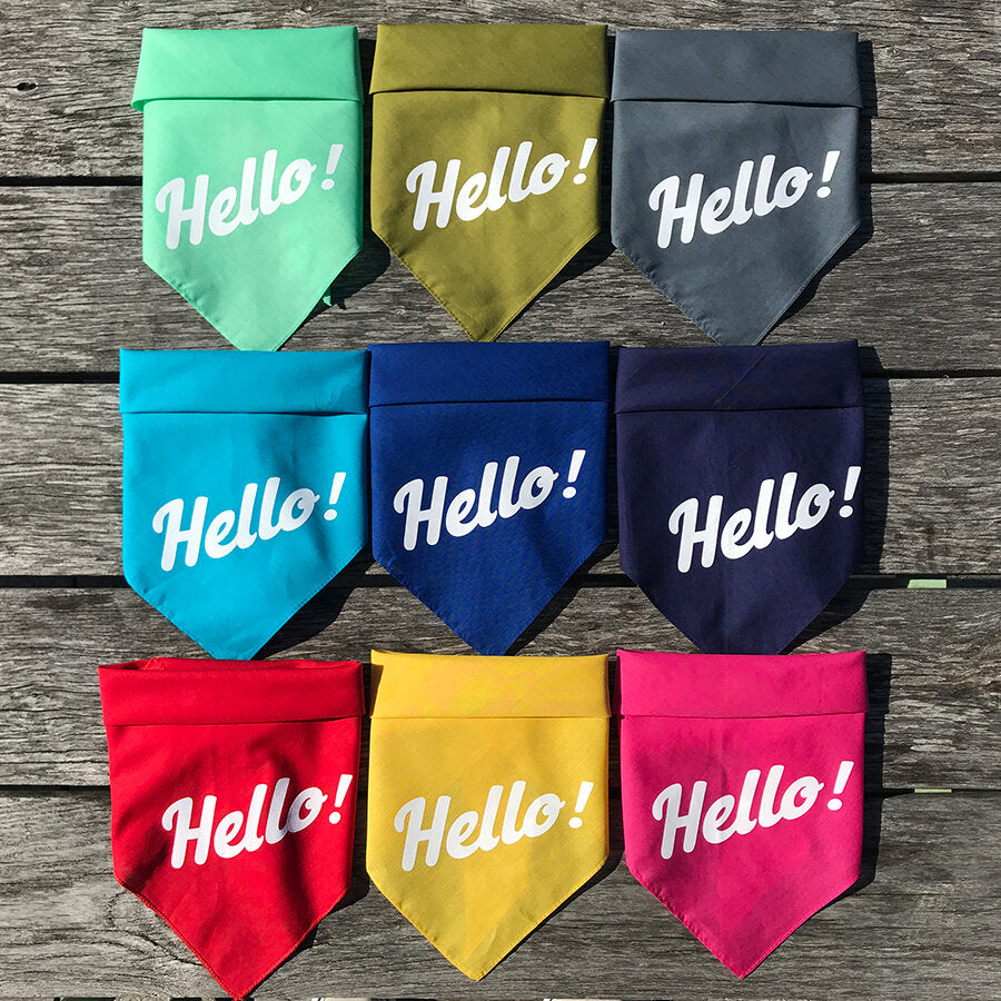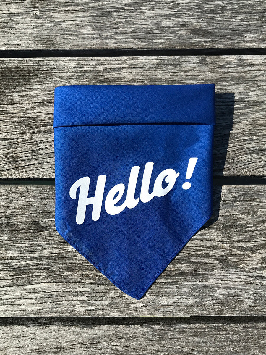 Now your dog or cat can greet humans with our new ‘Hello!’ pet bandana! This classic and bold design represents the simple happiness that animals bring to everyday life, and is hand printed locally in Brooklyn on imported bandanas.