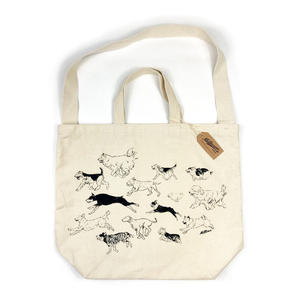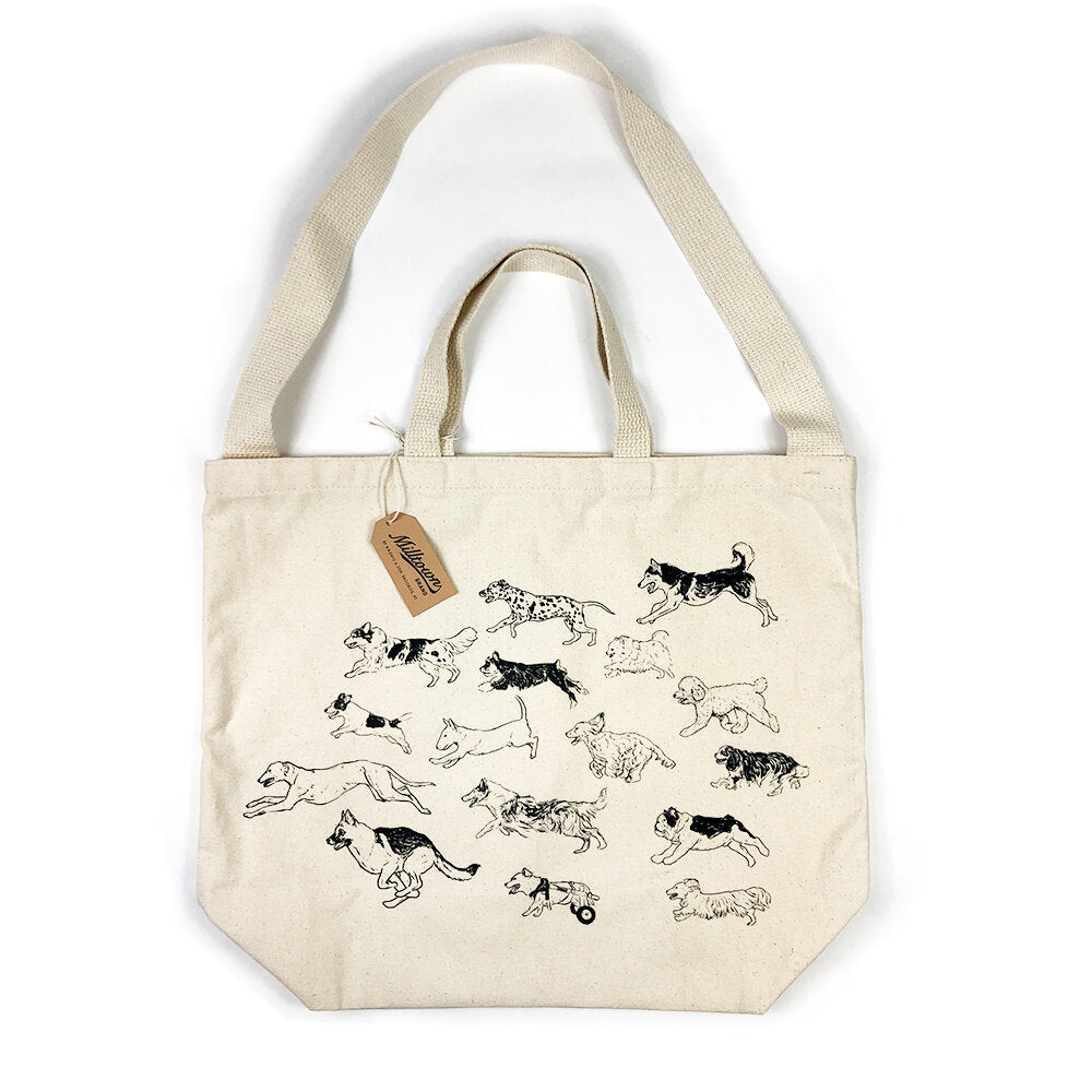 We love taking our dog, Brownie, to the dog park and watching all the different breeds run and play together. No matter what size, age, breed or even if they have a disabilty, every dog is welcome in the pack! On the backside of this bag, we have one of our favorite special pups, Oscar, in his wheelchair. Even being paralyzed from abuse in the past, he is full of love and always happy, and loves running and playing. Follow his inspiring story on Instagram @oxdad. This tote features hand-drawn images of lots of breeds running and chasing each other, so you can take the fun energy of the dog run with you anywhere!