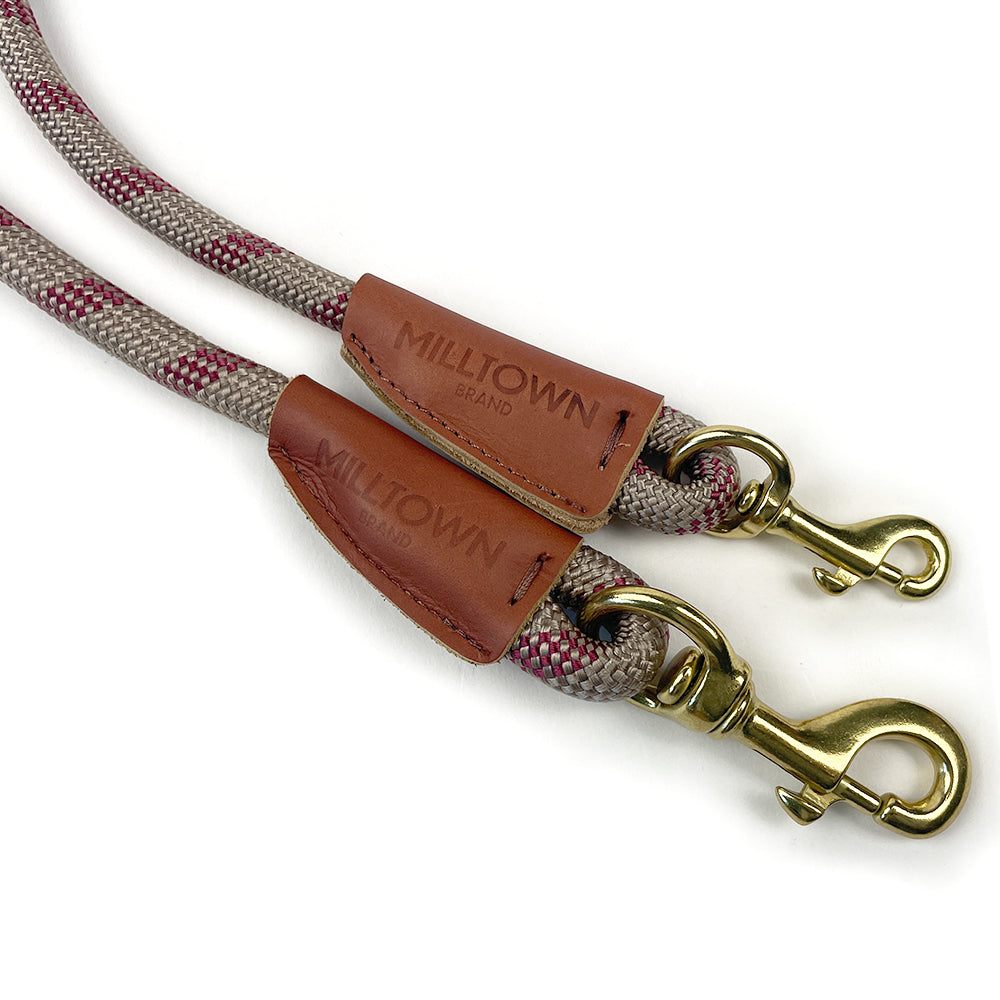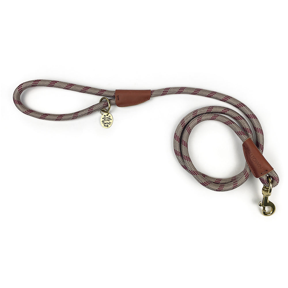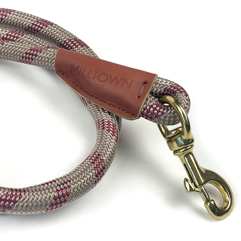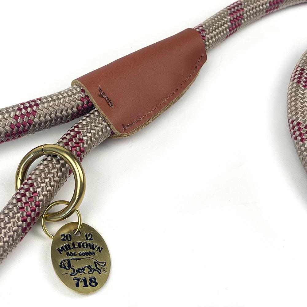 The Milltown Rope Leash brings together comfortable climbing-style nylon braided rope, premium leather, and solid brass hardware for a leash that is safe, secure, and stylish. The leashes feature a hand stamped Milltown Logo on the leather trim and a brass O-ring on the handle end for conveniently clipping our dog waste bag dispenser or any of our other accessories. A solid brass tag with an original design is included and can be used as a key chain, dog tag, or just a decoration.