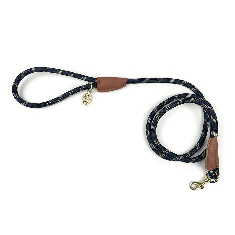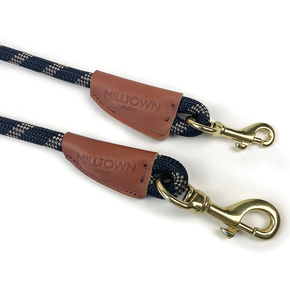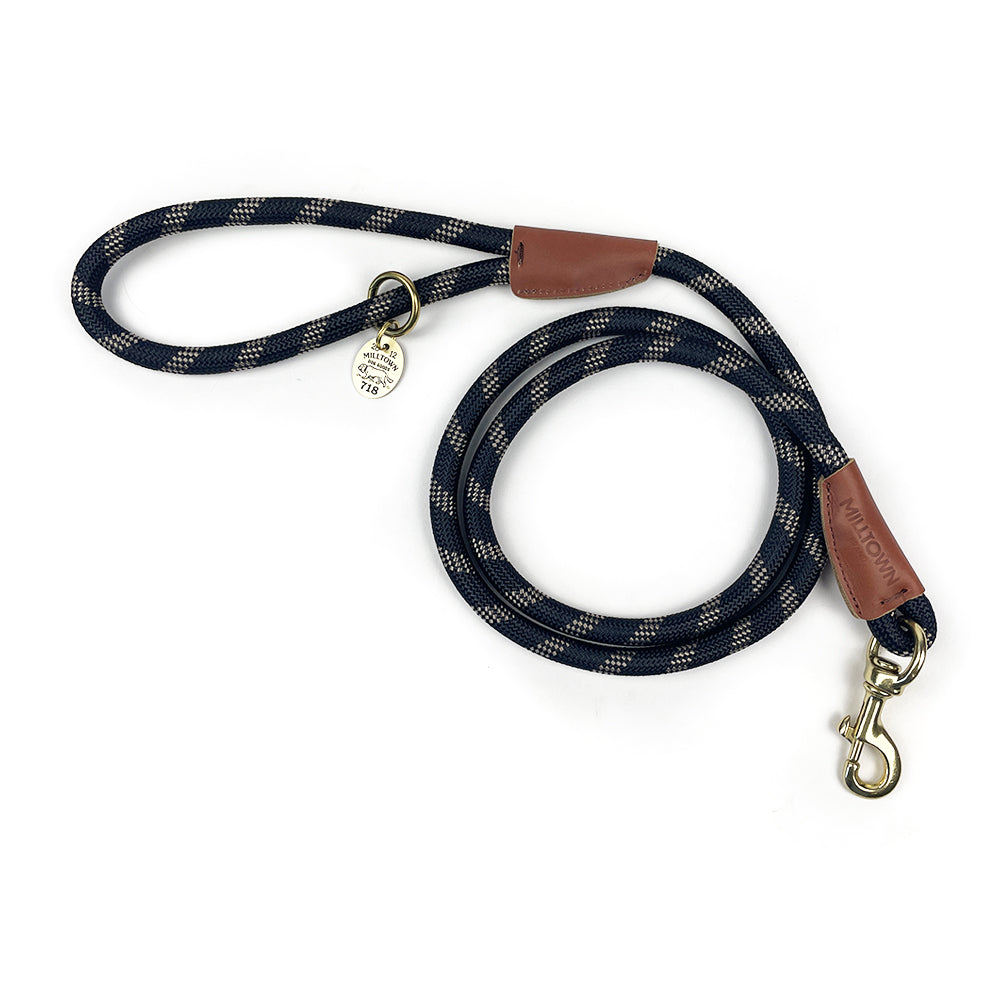Milltown Rope Leash brings together comfortable climbing-style nylon braided rope, premium leather, and solid brass hardware for a leash that is safe, secure, and stylish. The leashes feature a hand stamped Milltown Logo on the leather trim and a brass O-ring on the handle end for conveniently clipping our dog waste bag dispenser or any of our other accessories. A solid brass tag with an original design is included and can be used as a key chain, dog tag, or just a decoration.