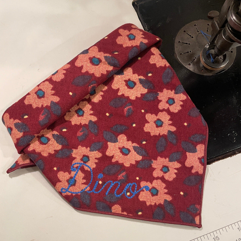 These cotton flannel Square Dog Bandanas are perfect for Fall & Winter! 100% cotton and featuring seasonal colors in two sizes, these bandanas are just what any pup needs to feel cozy and look stylish as the temperatures start to drop. The square bandanas are perfect as-is, or you can customize them with our new chain-stitch monogram service, or add iron-on Merit Badges from Scout's Honor on the other side of the triangle.