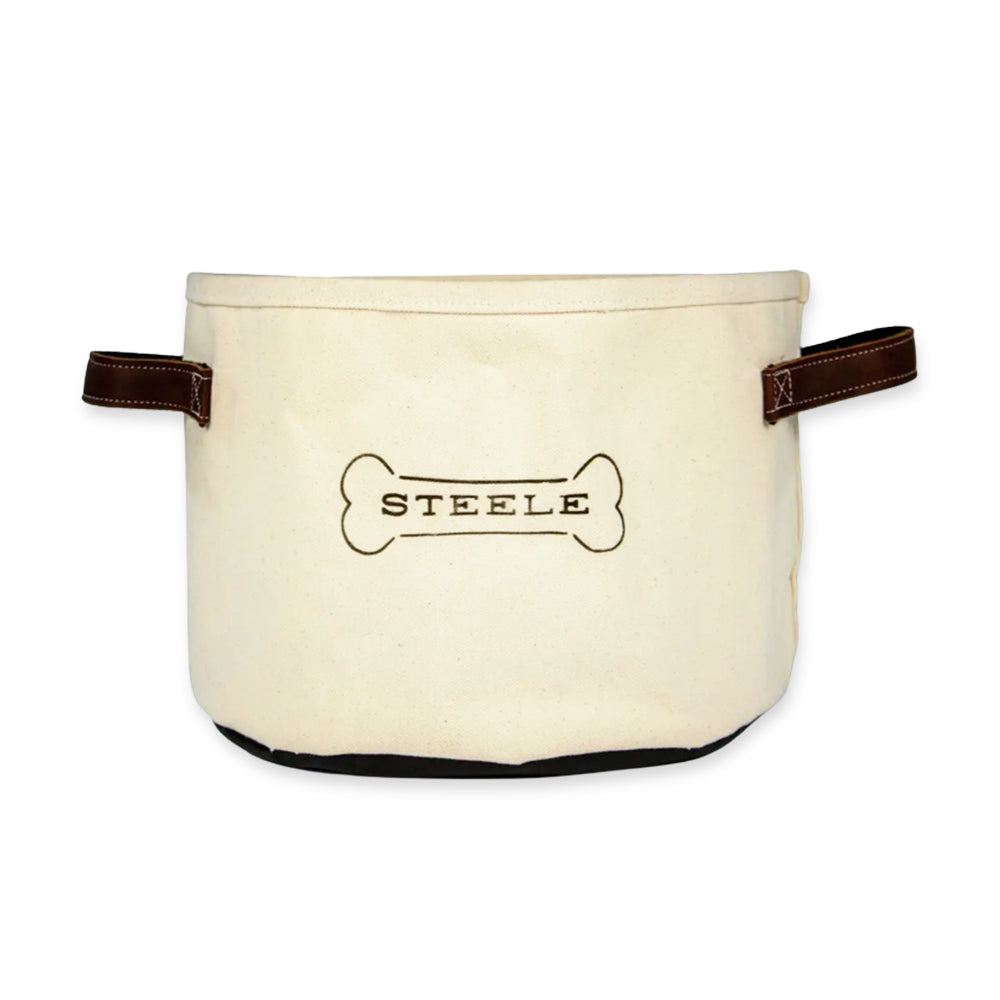 Tidy up your pup’s toys with this heritage-inspired dog toy basket from Steel Canvas Basket Corp. Crafted from heavy-duty #6 duck canvas with brown leather handles and a water-resistant vinyl bottom, it’s built for both function and style.